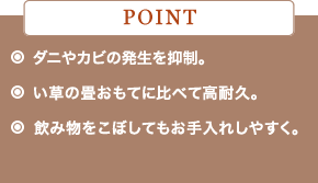 くつろぎの場に、畳は欠かせない。だけど、ダニやカビも心配ですよね。DAIKENは畳おもてに和紙を加工して使うことで、クリーンな状態を保ち、お手入れもしやすい畳を豊富にラインナップ。より心地よく健やかな、和みのひとときをお届けします。